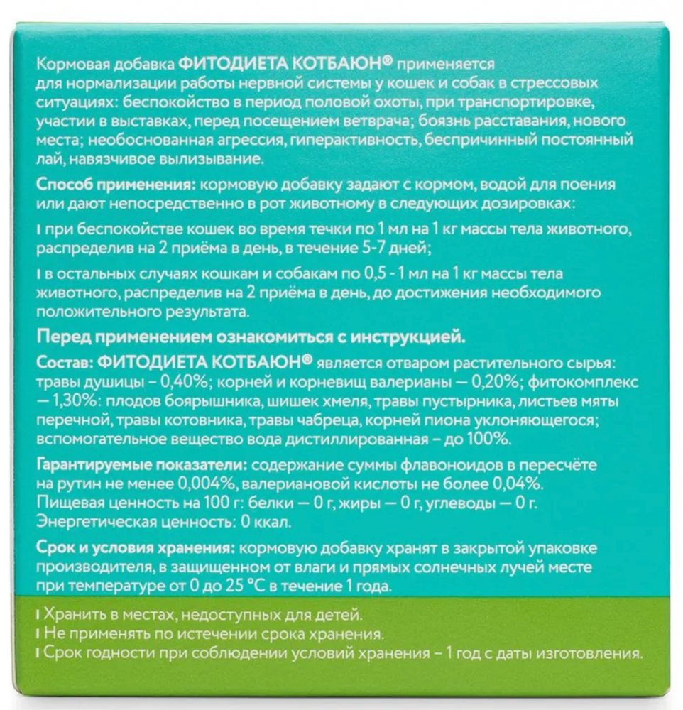 Кот Баюн® настой не содержит консервантов, поэтому при его применении следует соблюдать следующие требования: перед применением флакон откупоривают,