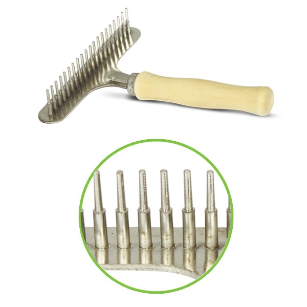 Расческа-грабли с удобной деревянной ручкой и 13 крупными металлическими зубцами. Изделие предназначено для мягкого расчёсывания шерсти пушистого питомца. Проволочные зубчики позволяют проводить расчёсывание аккуратно, без раздражения кожного покрова животного, доставляя ему большое удовольствие.