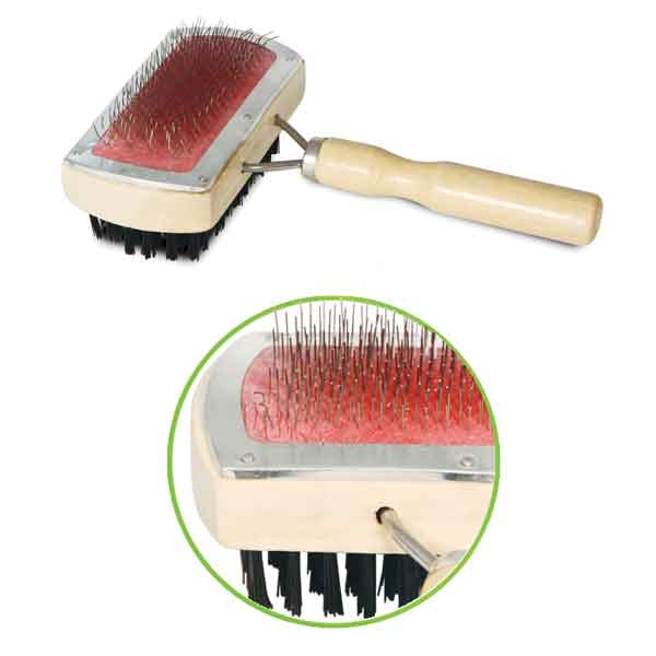 Удобная двустороняя щетка прямоугольной формы с деревянной ручкой обеспечивает нежный уход за верхним и базовым слоем шерсти животного.